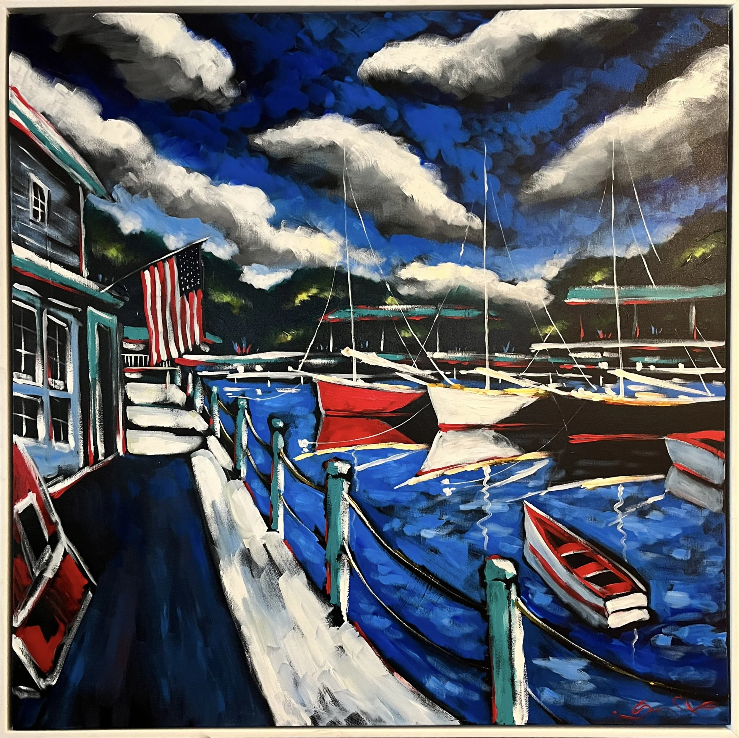 A Ship in Harbor, 50in x 50in framed, oil and acrylic on canvas, contact gallery for price