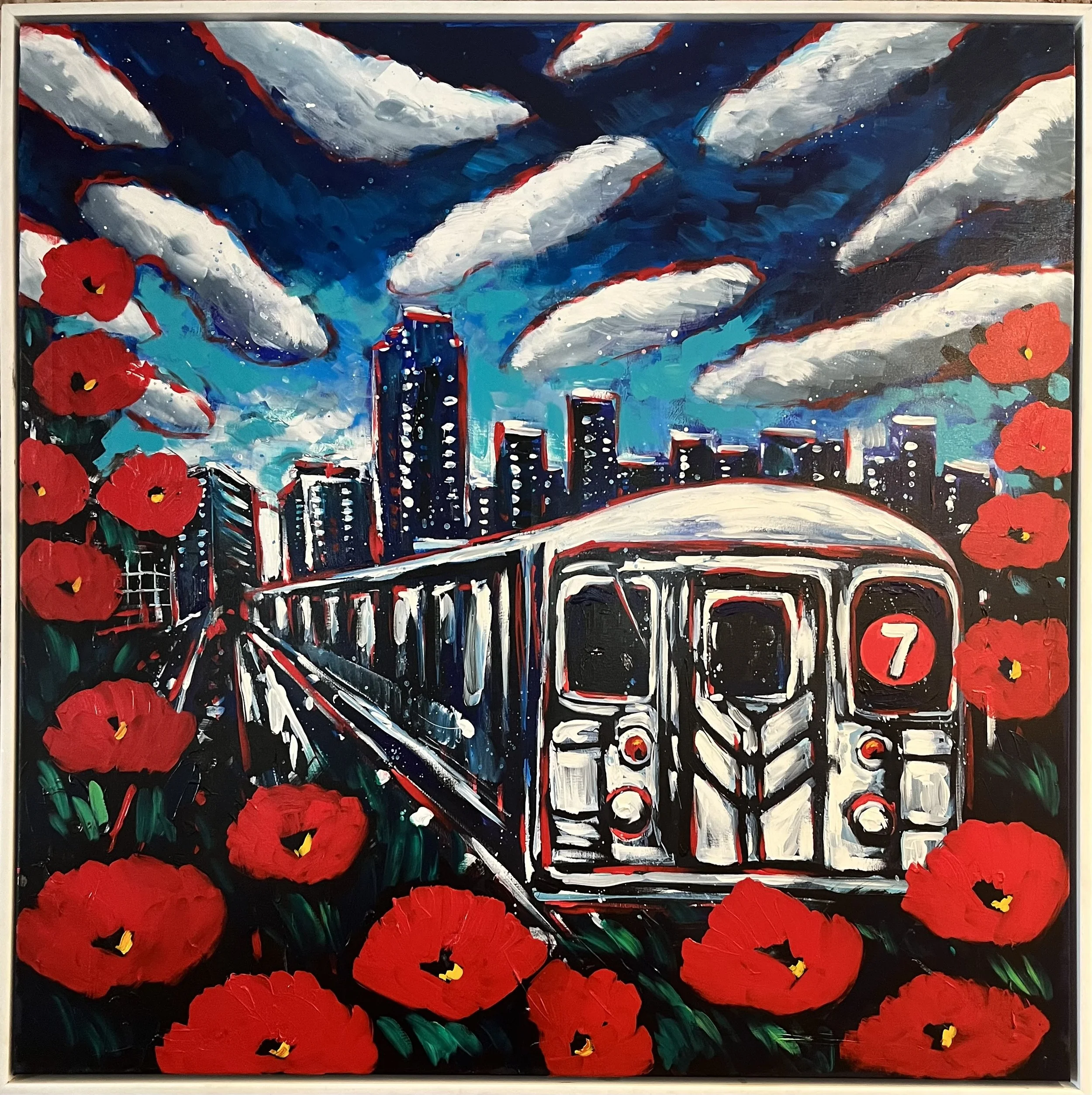 The International Express, 50in x 50in framed, oil and acrylic on canvas, contact gallery for price