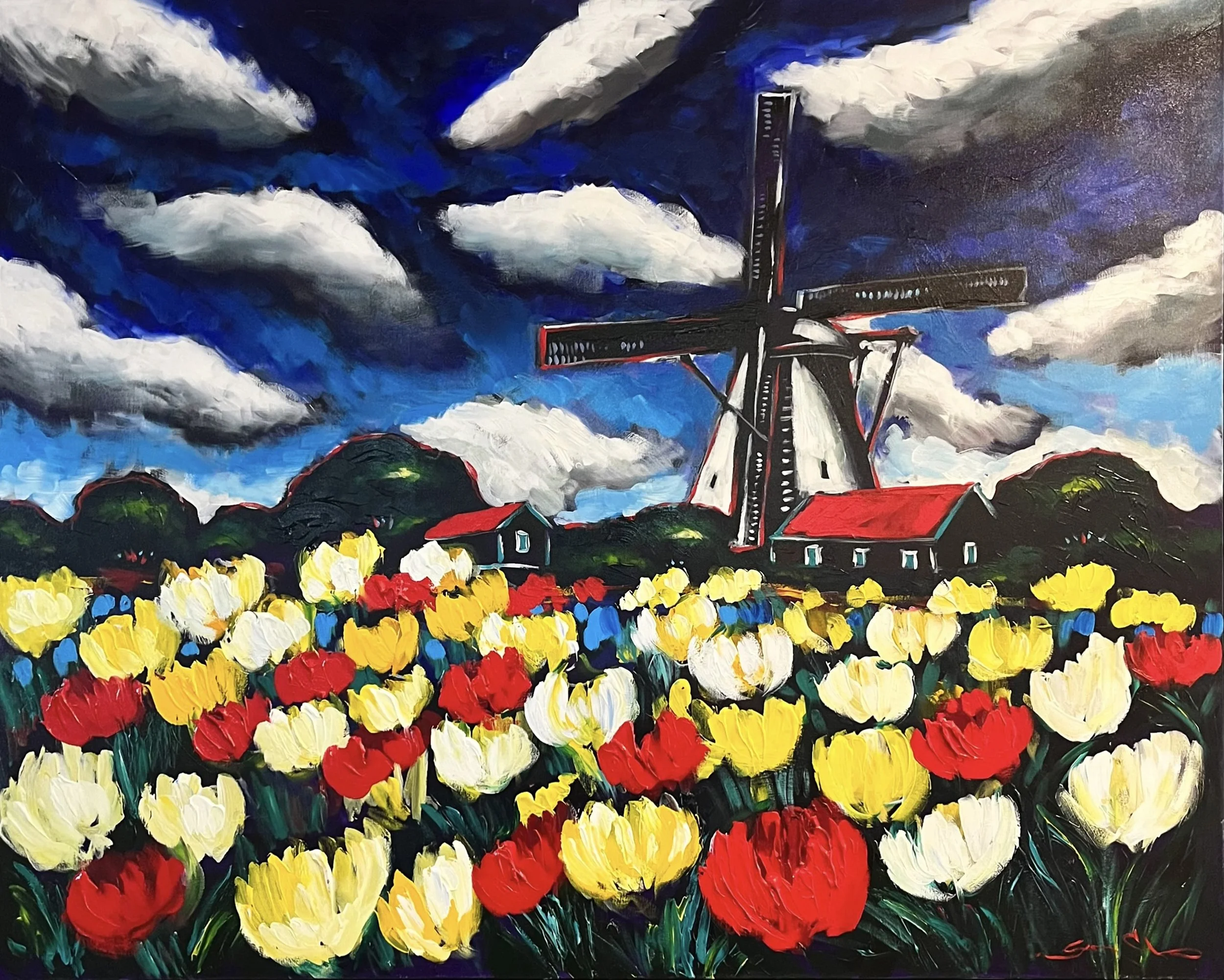 Tulips in Holland, 48in x 60in framed, oil and acrylic on canvas, contact gallery for price