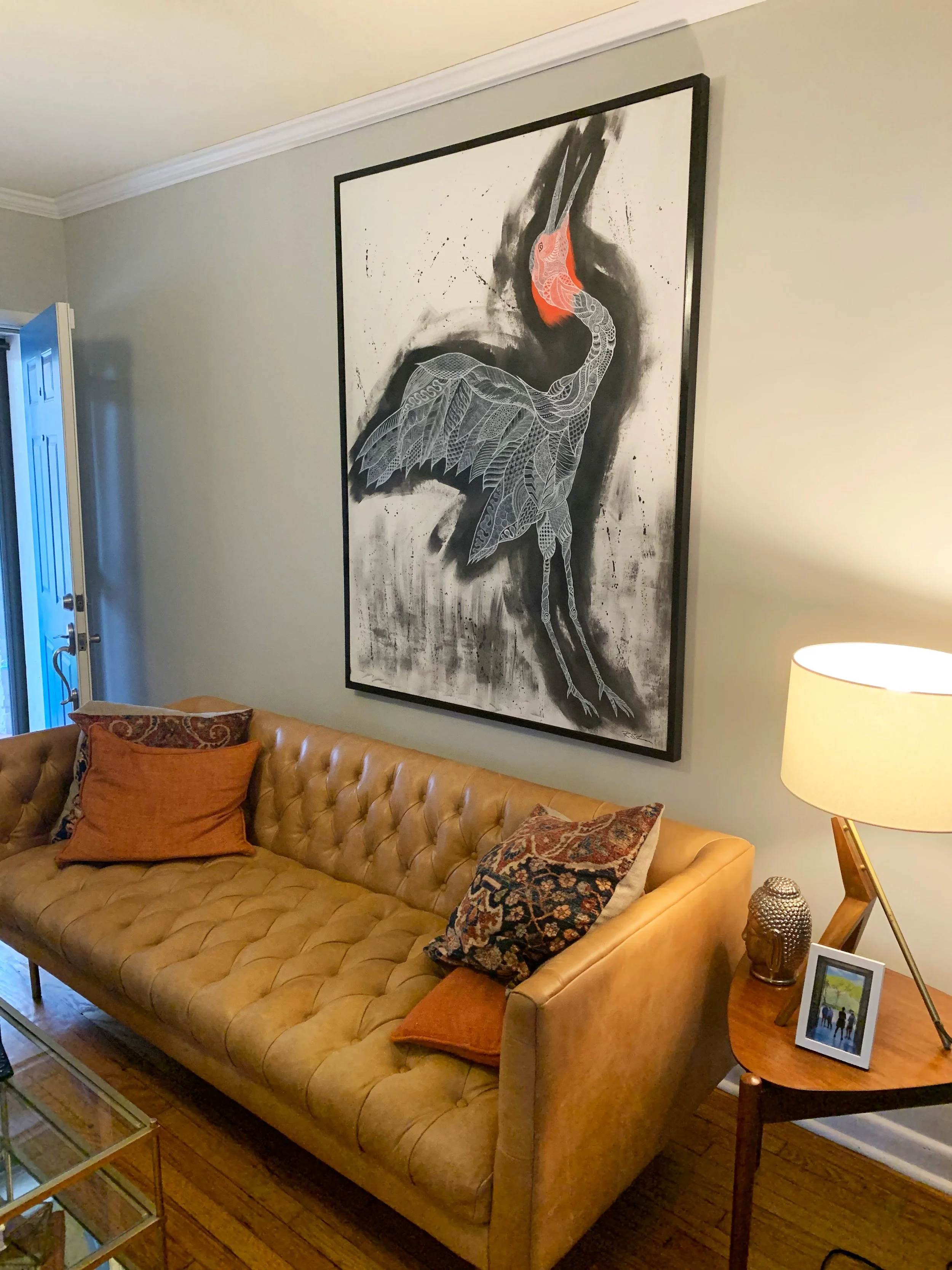 Work with the age and architectural details of your home, or juxtapose them! Every home tells a story. See the picture below; notice the contrast between the older features of the fireplace, and the contemporary pieces by Neeka Allsup and Emily Elhoffer. Consider artworks that reflect the age of your home, and the decorative style.